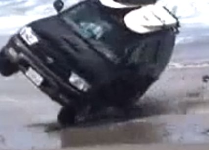 Hoe kun je een lekker dagje surfen in de zee nu beter afsluiten dan door met je SUV door de branding te crossen en te slippen. Heerlijk toch. Totdat het een beetje misgaat en de glijpartij eindigt in een koprol.