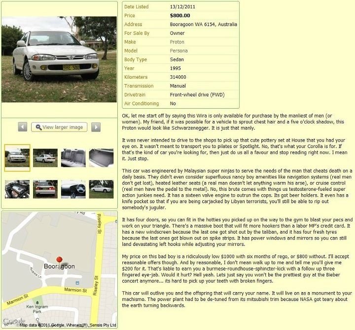 Iets verkopen is niet eenvoudig. Naast een goede presentatie hoort er ook een leuk stukje tekst bij dat de toekomstige koper moet verleiden tot een aankoop. En in dat stukje tekst kun je best veel creativiteit kwijt. Check onderstaande advertentie tekst voor het verkopen van een auto, maar niet een gewone auto: het gaat om een Proton Wira met super powerrrr.