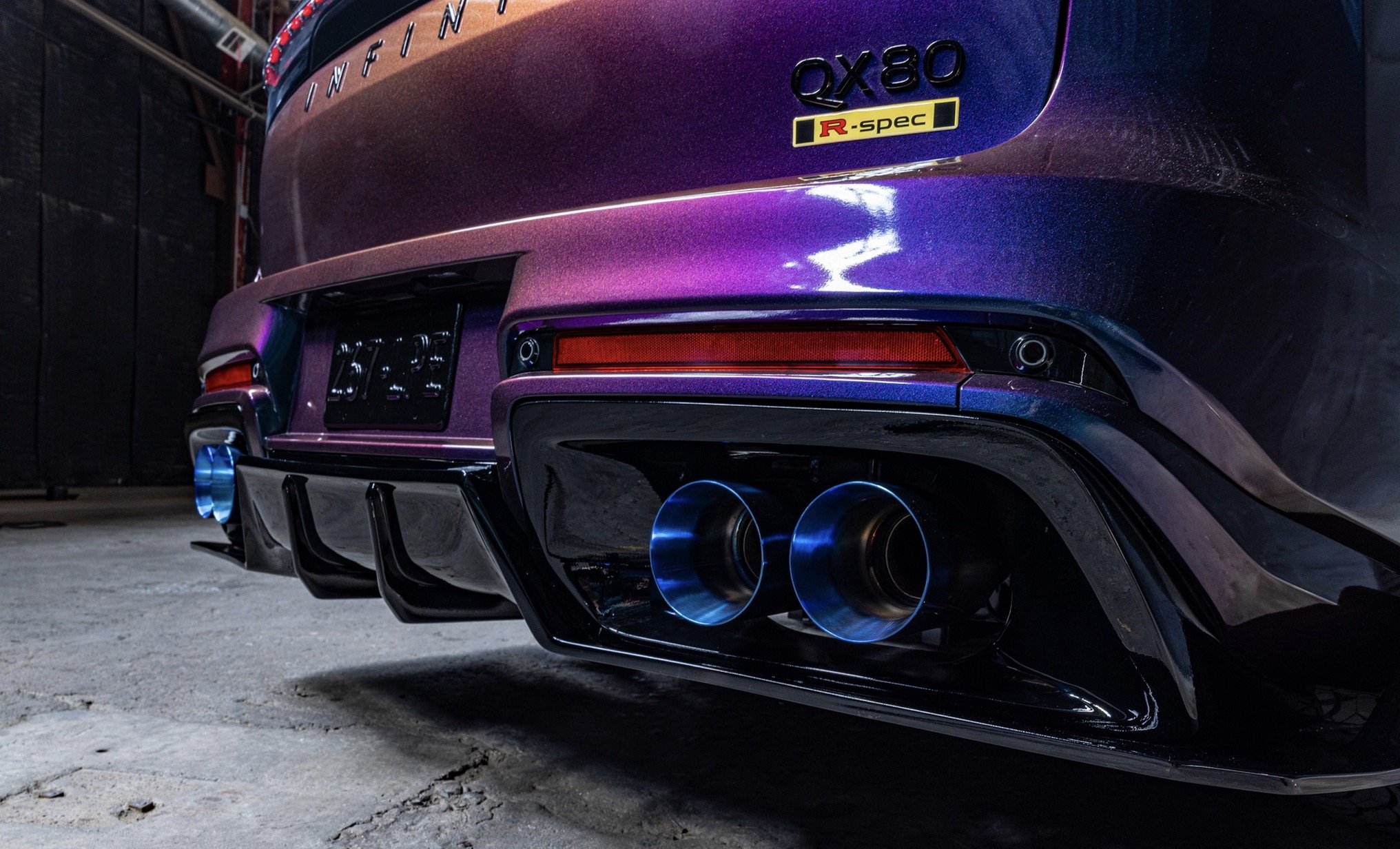 Visueel is de QX80 R-Spec een statement op wielen. Een widebody kit geïnspireerd op de GT-R T-Spec Takumi transformeert het silhouet volledig. Een ARP frontsplitter, aangepaste bumpers, zijskirts en een enorme achterspoiler geven de SUV een agressieve uitstraling die past bij de prestaties.